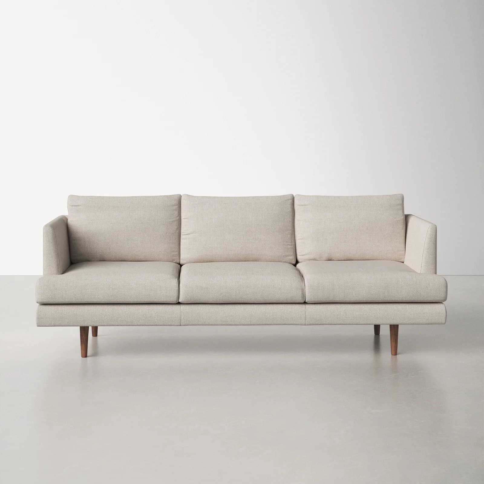 The anchor of any living room, sofas are central for both giving everyone a seat during a movie marathon or game night, while also tying together your space's look. So if you're looking to put together a room with a modern touch, try a sofa like this! Crafted with a manufactured wood frame, this piece features recessed arms, a streamlined silhouette, and tapered dowel feet for a mid-century-inspired contemporary look. Foam and fiber filling gives the cushions an inviting feel, while the fabric allows this sofa to be easily added to a variety of color schemes.