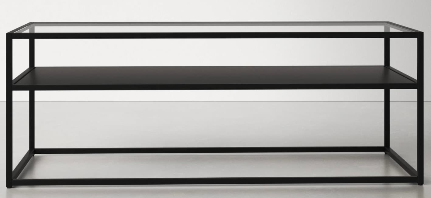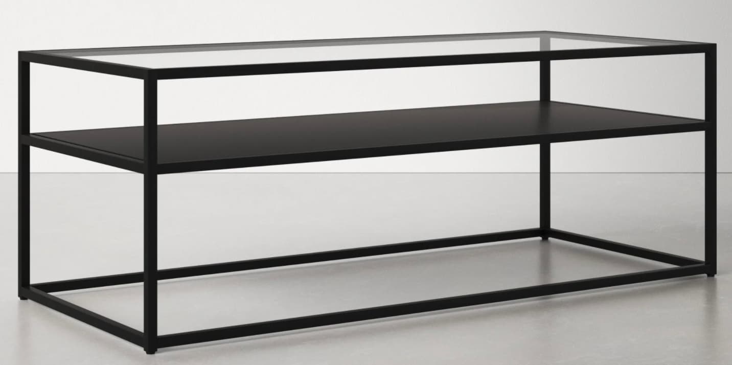 This industrial display box-styled coffee table features a seamless blend of function and design. Easy to assemble and easy to style, the tempered glass top, metal shelf, and blackened bronze finish make it the perfect addition to your living room or den ensemble.