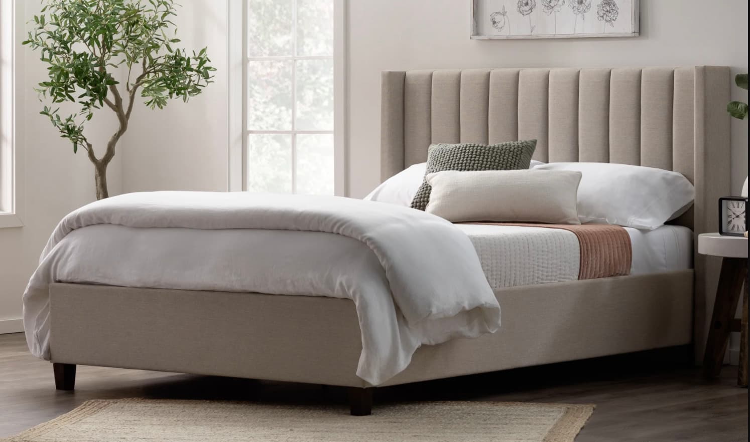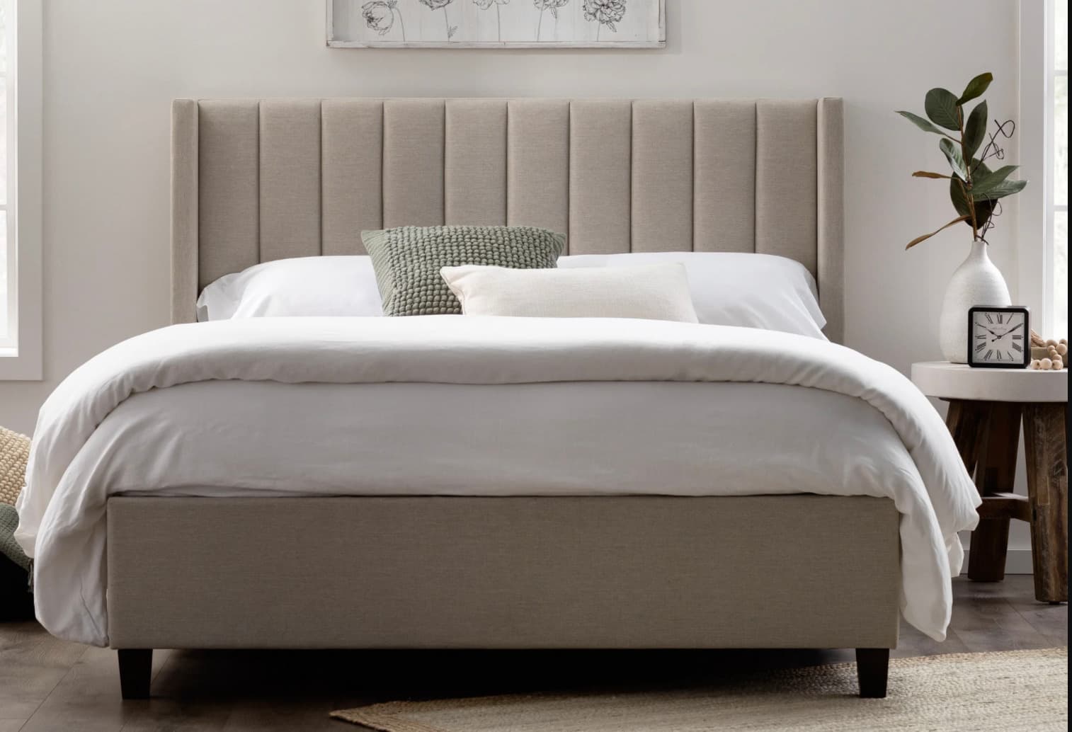 The upholstered platform bed frame brings a touch of elegance with its wingback-style headboard and modern channel tufting. Crafted with a solid wood frame, this low-profile bed has 4" of under-bed clearance and polyester upholstery on the footboard, side rails, and headboard for added comfort. Its fresh design and neutral hue make this bed fit in with decor styles ranging from boho to industrial. We love that this bed includes slats and center supports, so there's no need for a box spring. We recommend pairing a 12" thick mattress with this bed (sold separately).