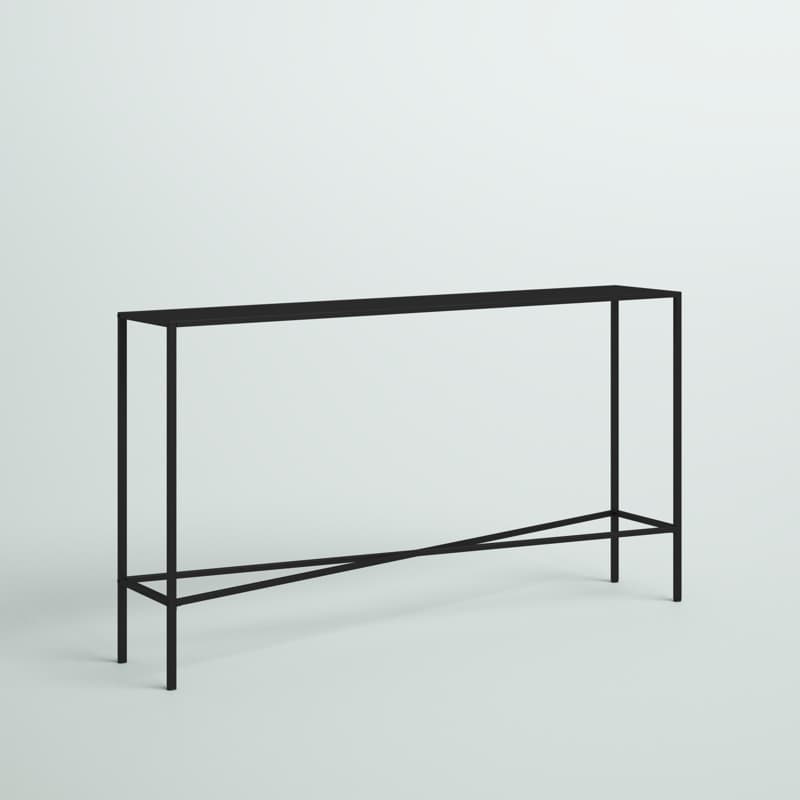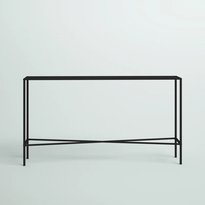 Full of sleek minimalism and industrial flair, this rectangular console table is just the platform you need for potted plants and other decor. It's crafted from steel with a blackened bronze finish that matches almost any color palette you want. The clean lines of the tabletop and frame are offset by the geometric crossbar, creating visual interest while also providing plenty of support. Measuring 30" tall, this table looks phenomenal behind a living room sofa or against the wall in your entryway.