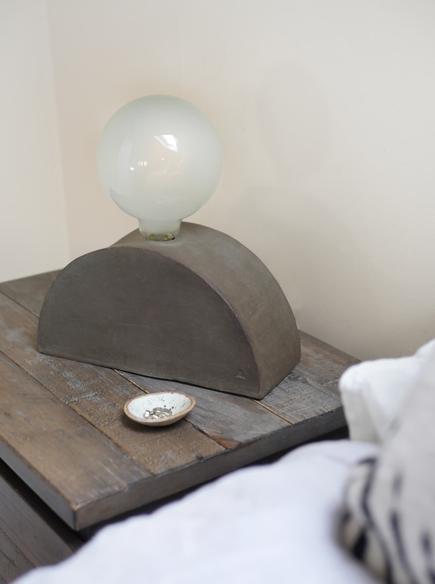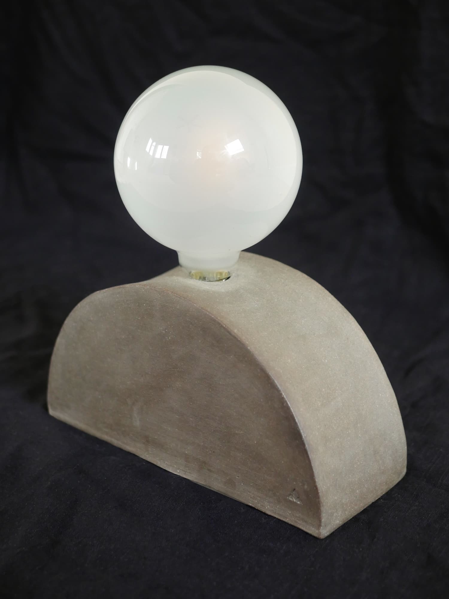 An ash gray half moon lamp with an exposed globe lightbulb. Clay is raw – no glaze.