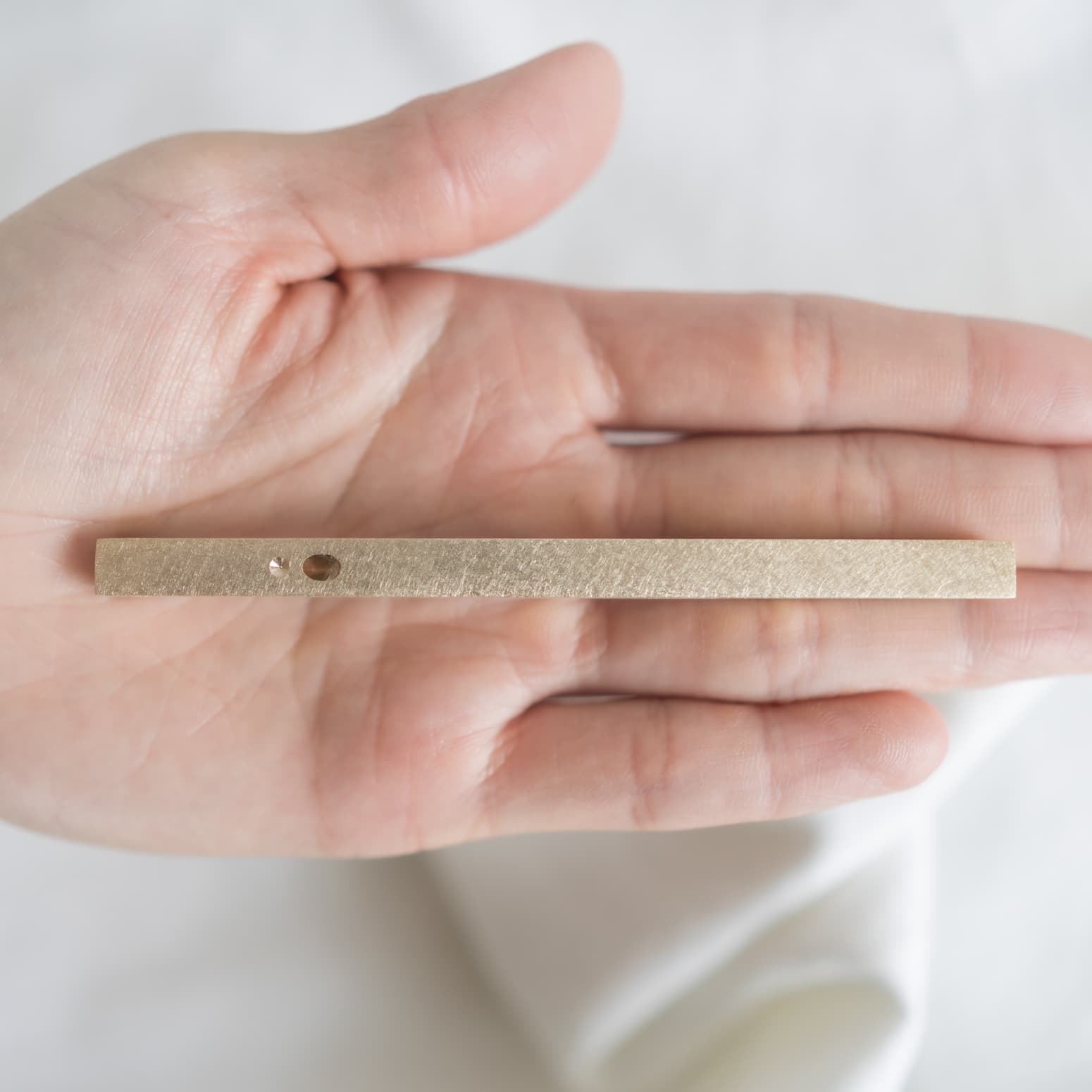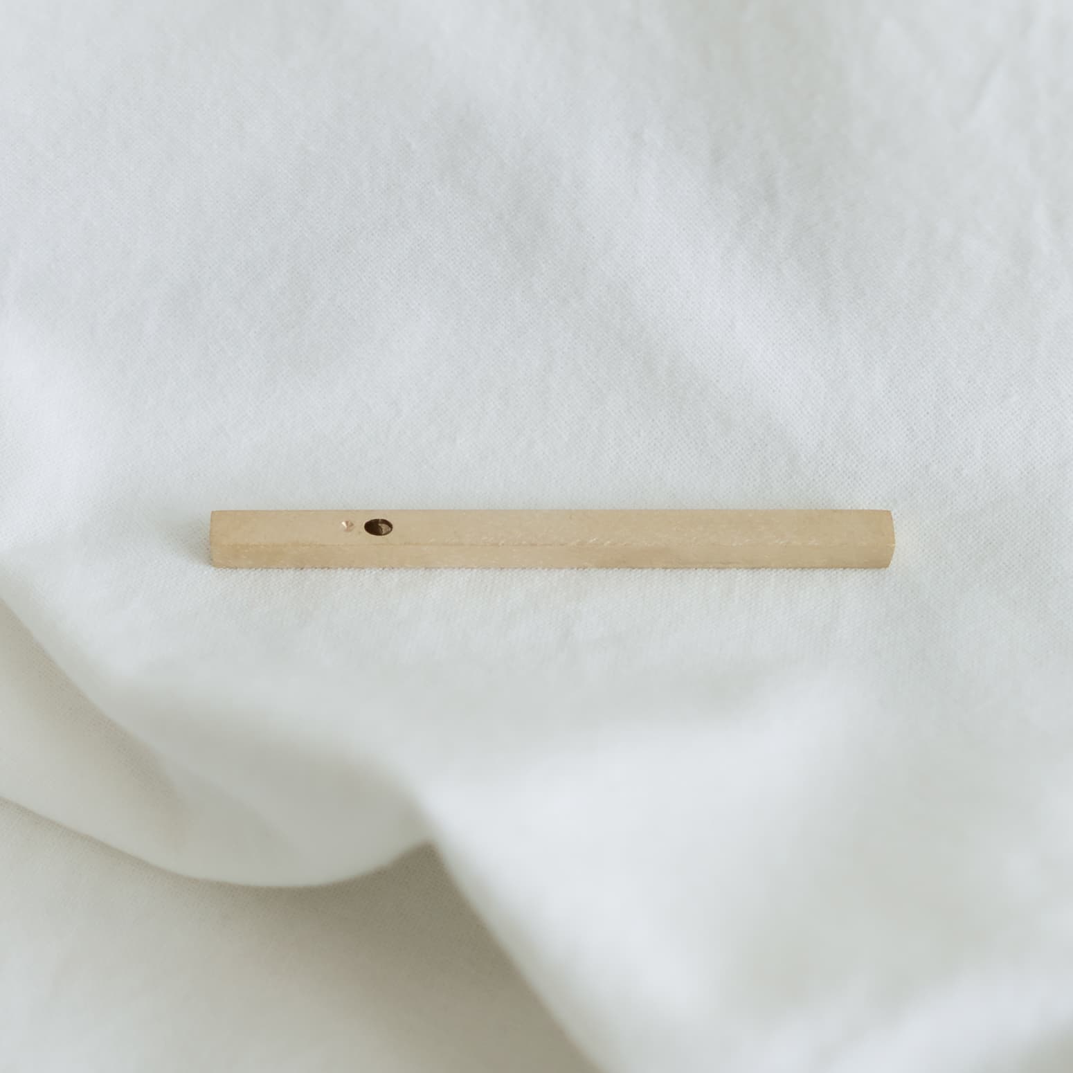 Our simple and beautiful linear incense holder helps to position and burn your favorite incense sticks as the scent purifies the air and soul. Each incense holder is uniquely handcrafted using solid brass and is completed with a matte brushed finish. It measures 4” in length by .25” square diameter. The incense sticks rest and burn at an angle with our token dimpled-side of the holder facing towards the sky.