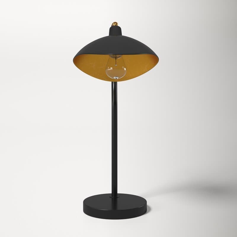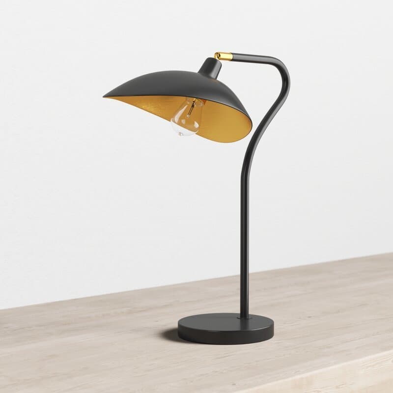 Bring a little light to your space with this iron table lamp. The circular base supports the curved arm for a distinctive silhouette. A bowl-shaped shade that’s made from iron and lined with a gold finish tops the design for added brightness. The shade can be adjusted to direct the light of the 13W bulb (not included) to anywhere you need it. The on/off switch is located on the cord.
