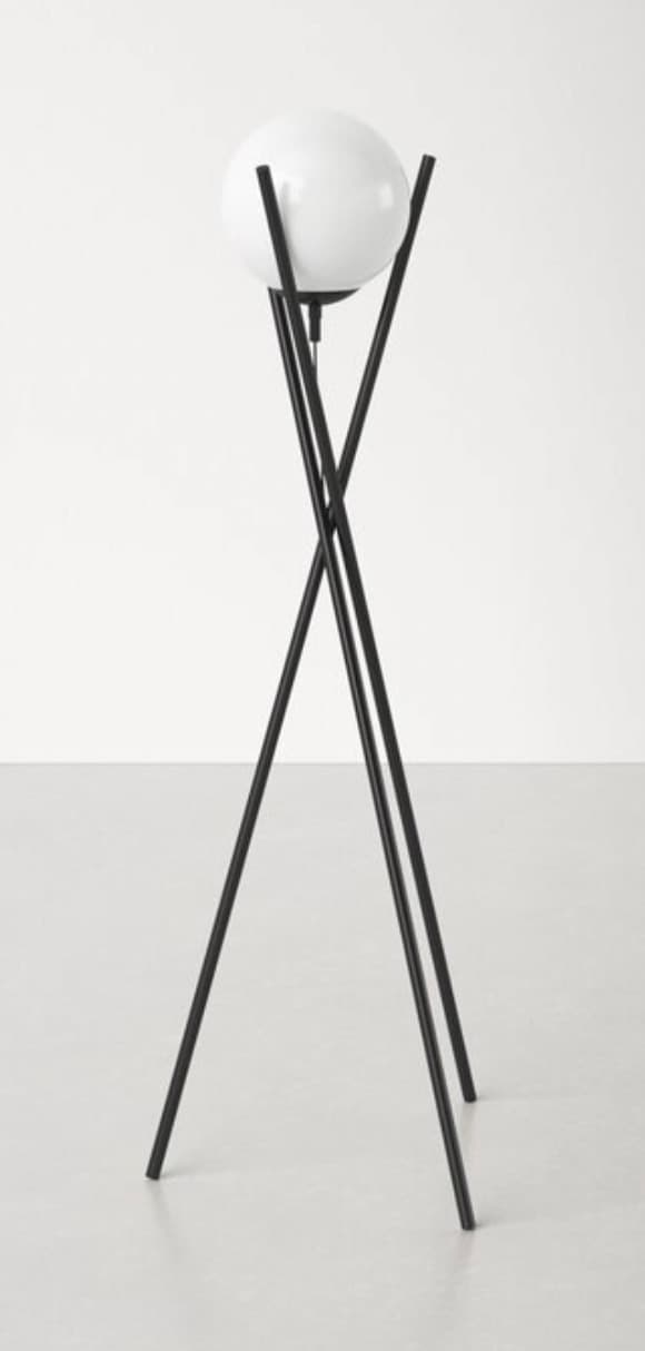 This modern, forward-thinking floor lamp is an easy way to update your living room or home office. Its crisp, minimalist design is made from metal and sits on three thin crisscrossed feet. The versatile matte black finish goes with everything and adds an elegant contrast against the centered opal white glass shade. This LED-compatible lamp houses a single bulb up to 60W (sold separately). It stands at 59" tall, so it makes a statement without pulling too much focus away from your existing decor.