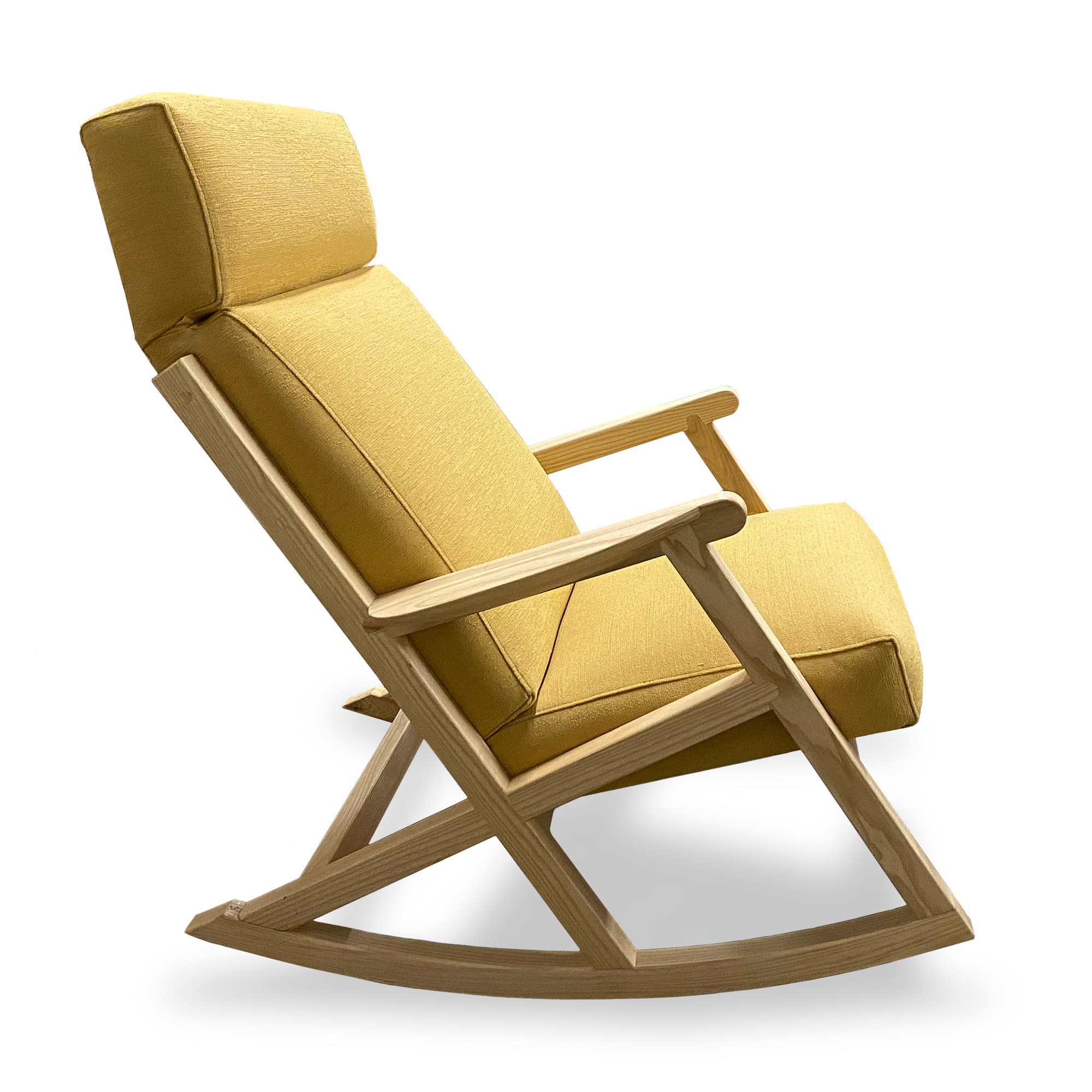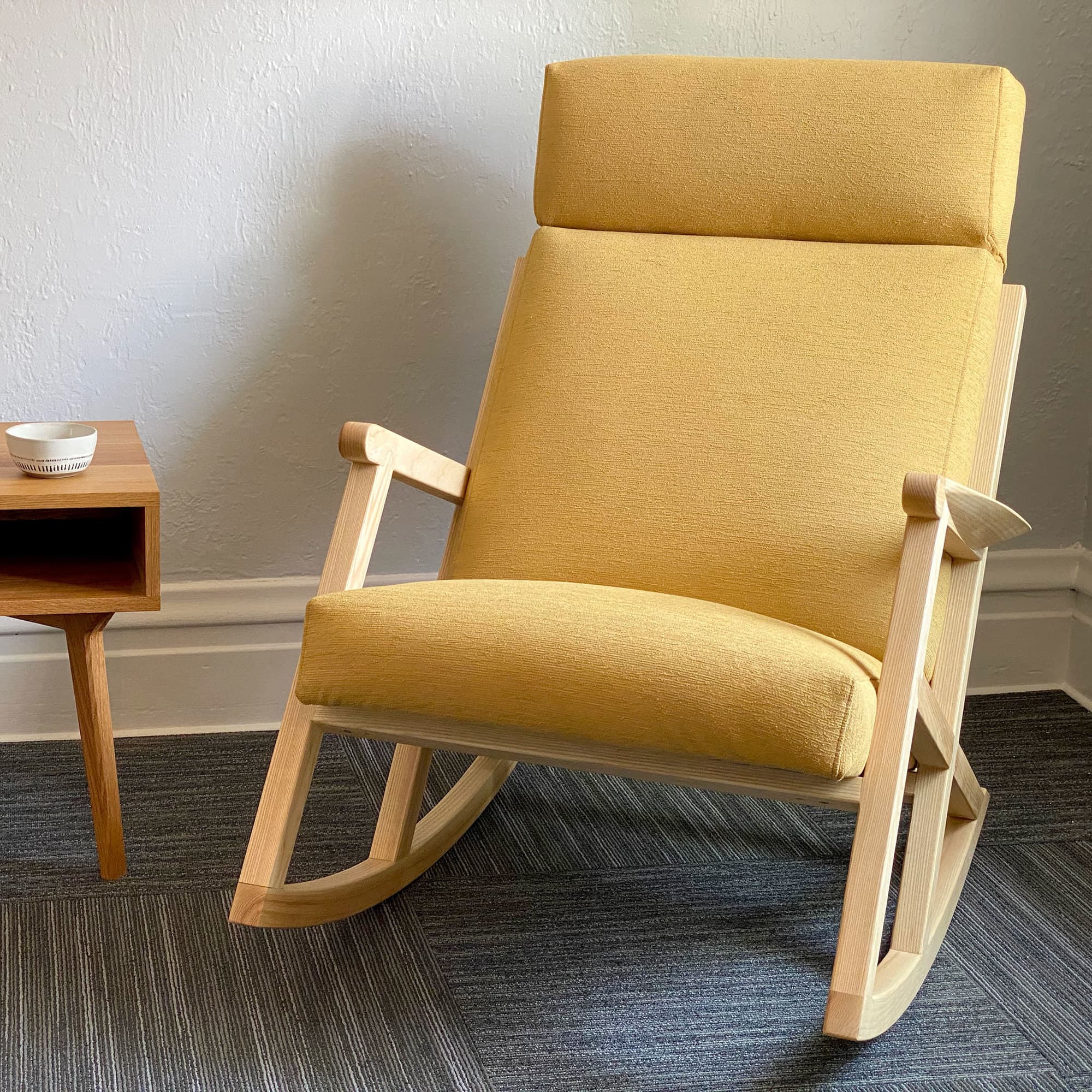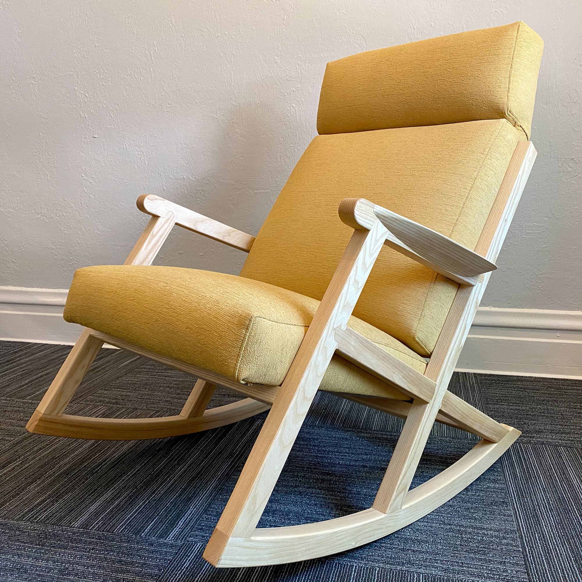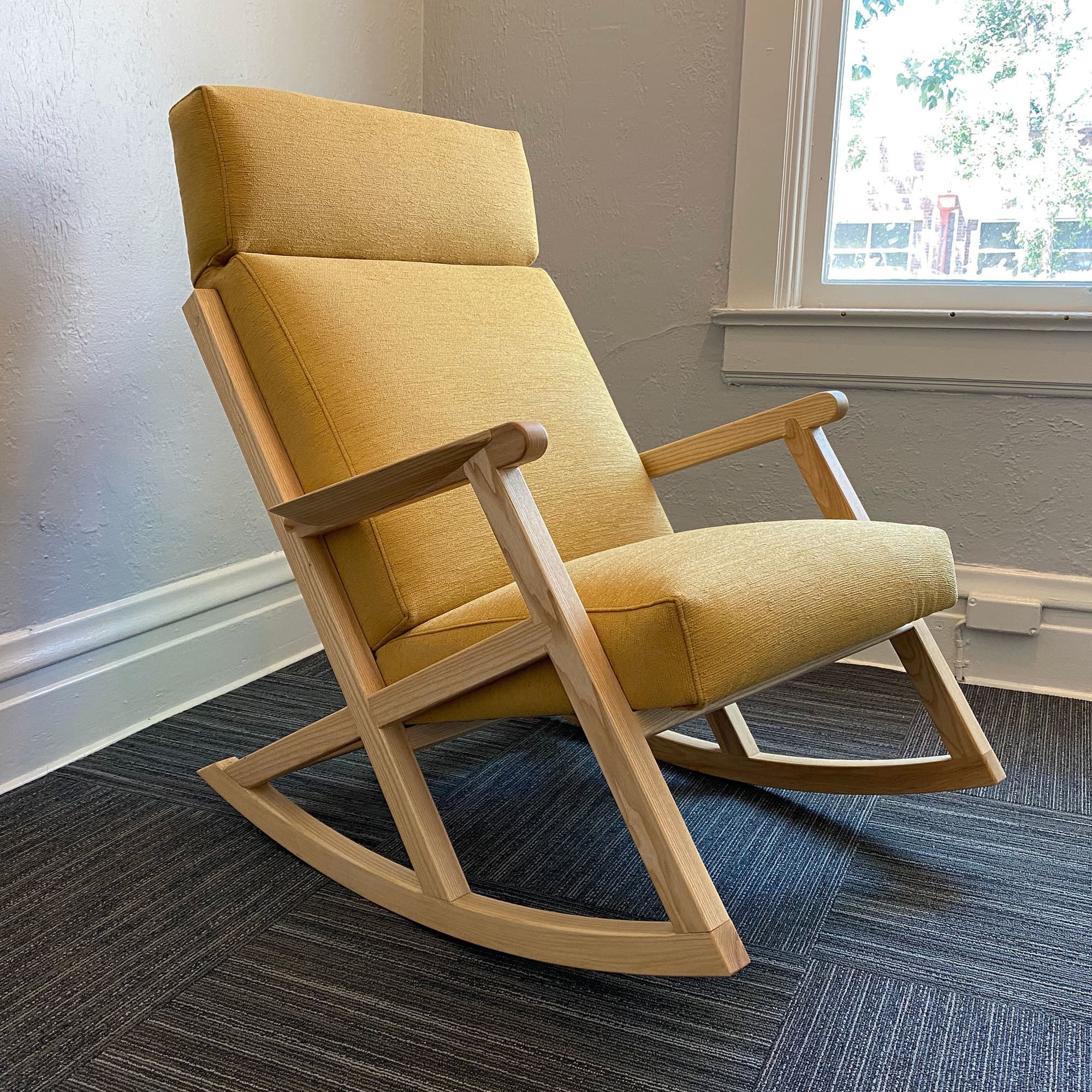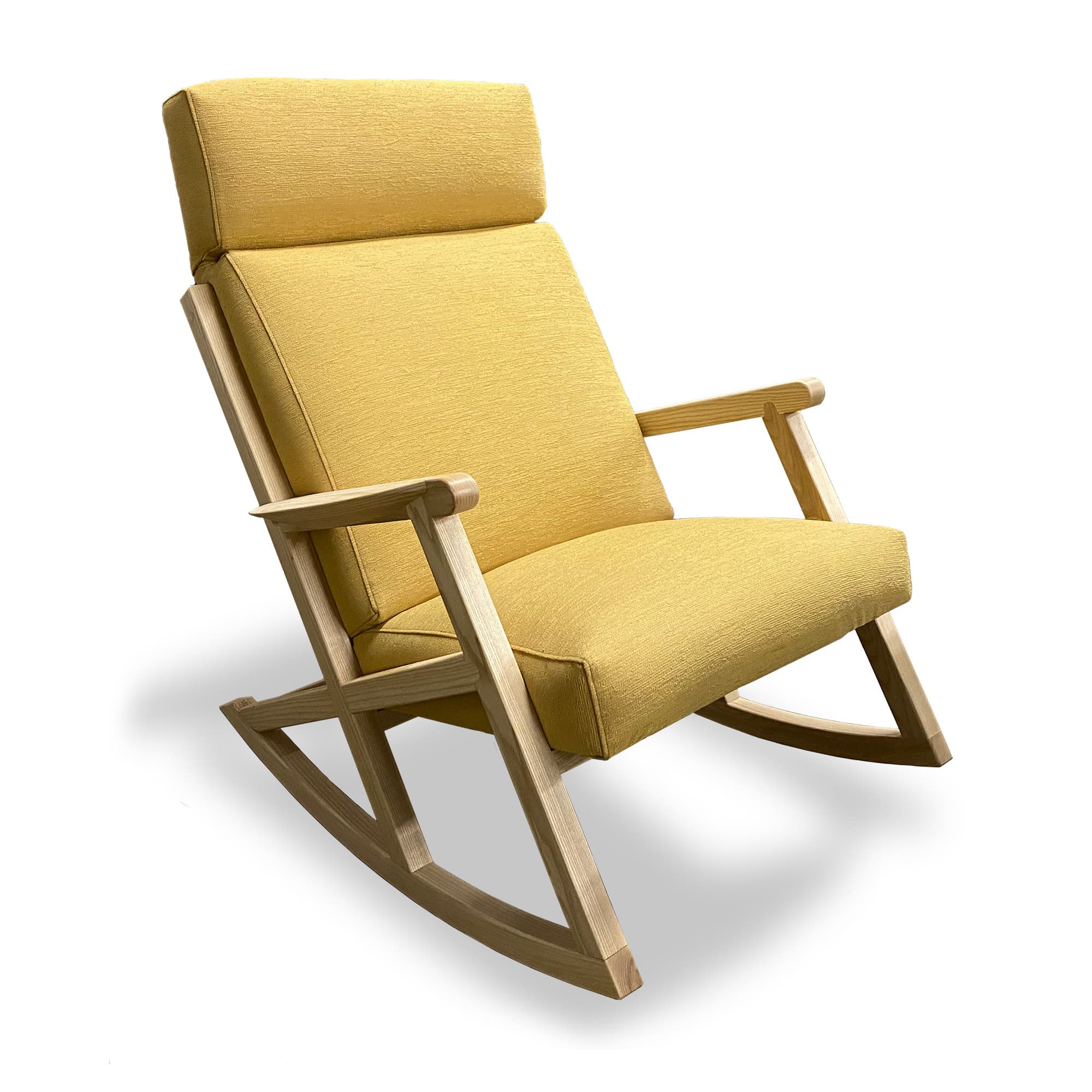 Relax and recharge in our Nappe Rocker. Crafted in solid ash, the intriguing angles and comfy upholstery form a modern rocking chair perfect for engaging, meditating, soothing, or dare we say it, napping. Choose from our standard or scratch-resistant (cat-friendly) fabrics. (Shown in Sunbeam).