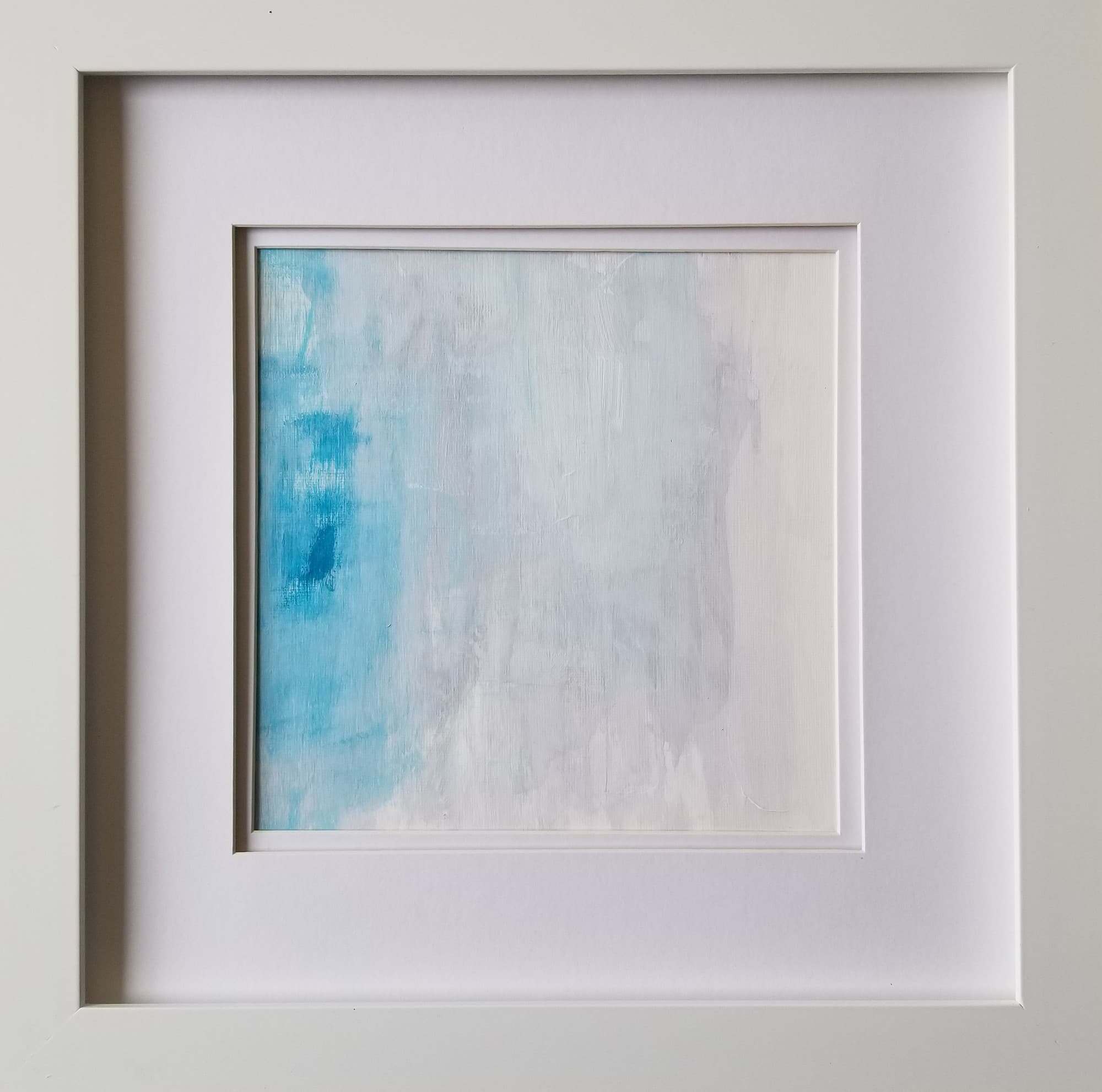 Subtle abstract in teal, light gray, and very light pink in white frame. 1 of 4 in a series, can be used alone or with others from the series.
