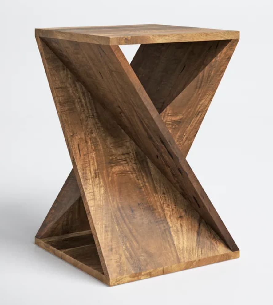 Arriving fully assembled, this end table is handcrafted from solid wood and brings the latest in innovative modern design into your home. Sharp sleek angles combined with a natural wood grain finish make this table a standout anywhere you choose to place it. The deep coloring in the finish allows you to see every natural variation in the wood, while the complex design celebrates the hand-crafted artisan look of the piece.