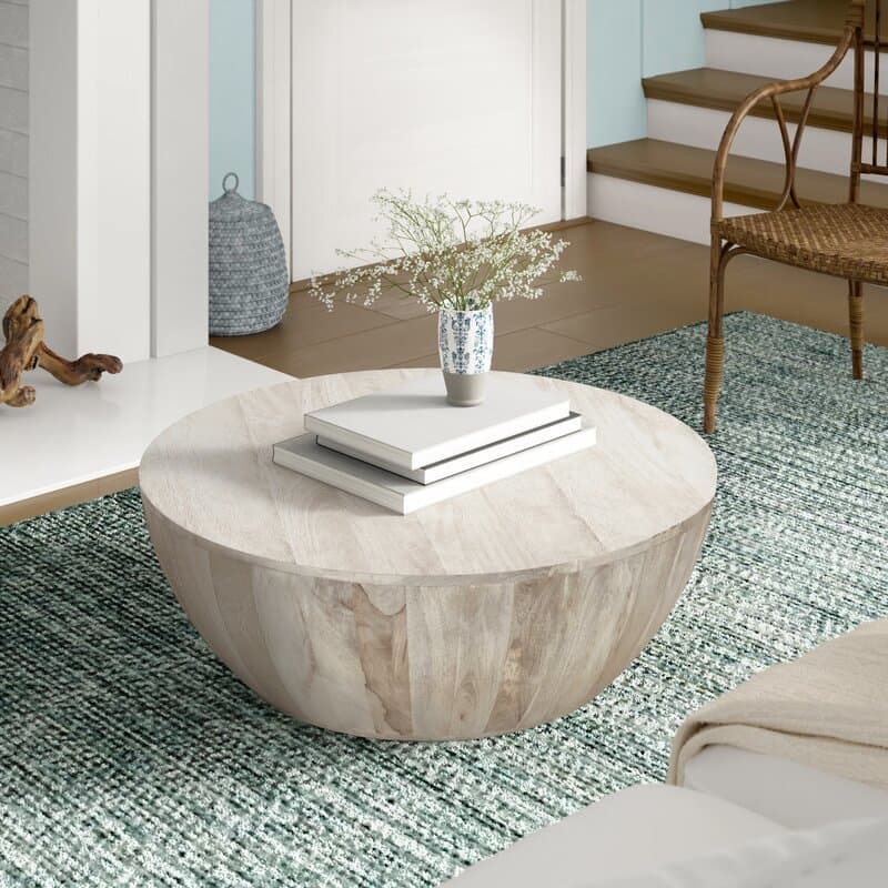 Showcasing a great piece of artistry, this round-shape coffee table features a smooth wide top that can be used for serving and displaying various decorative items. This coffee table has a narrow flat base that provides good stability on the ground. The washed light brown finish adds depth to its distressed plank wood texture, transmuting your setting into a casual space. Handcrafted in finest quality mango wood, there may be a variation in color, finish, wood grain and knots due to various natural and artificial factors. These characteristics make your product special and unique and are not defects.